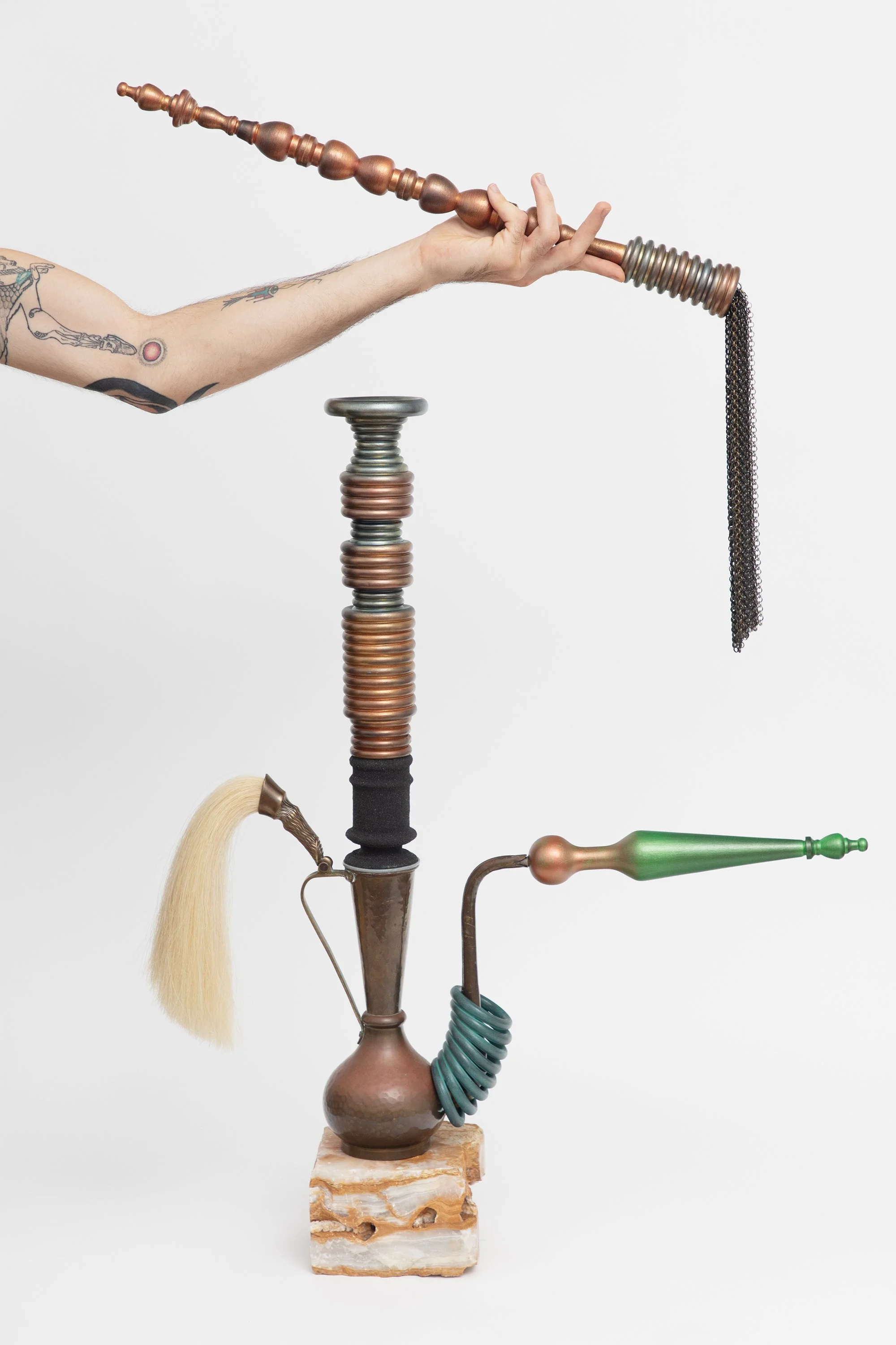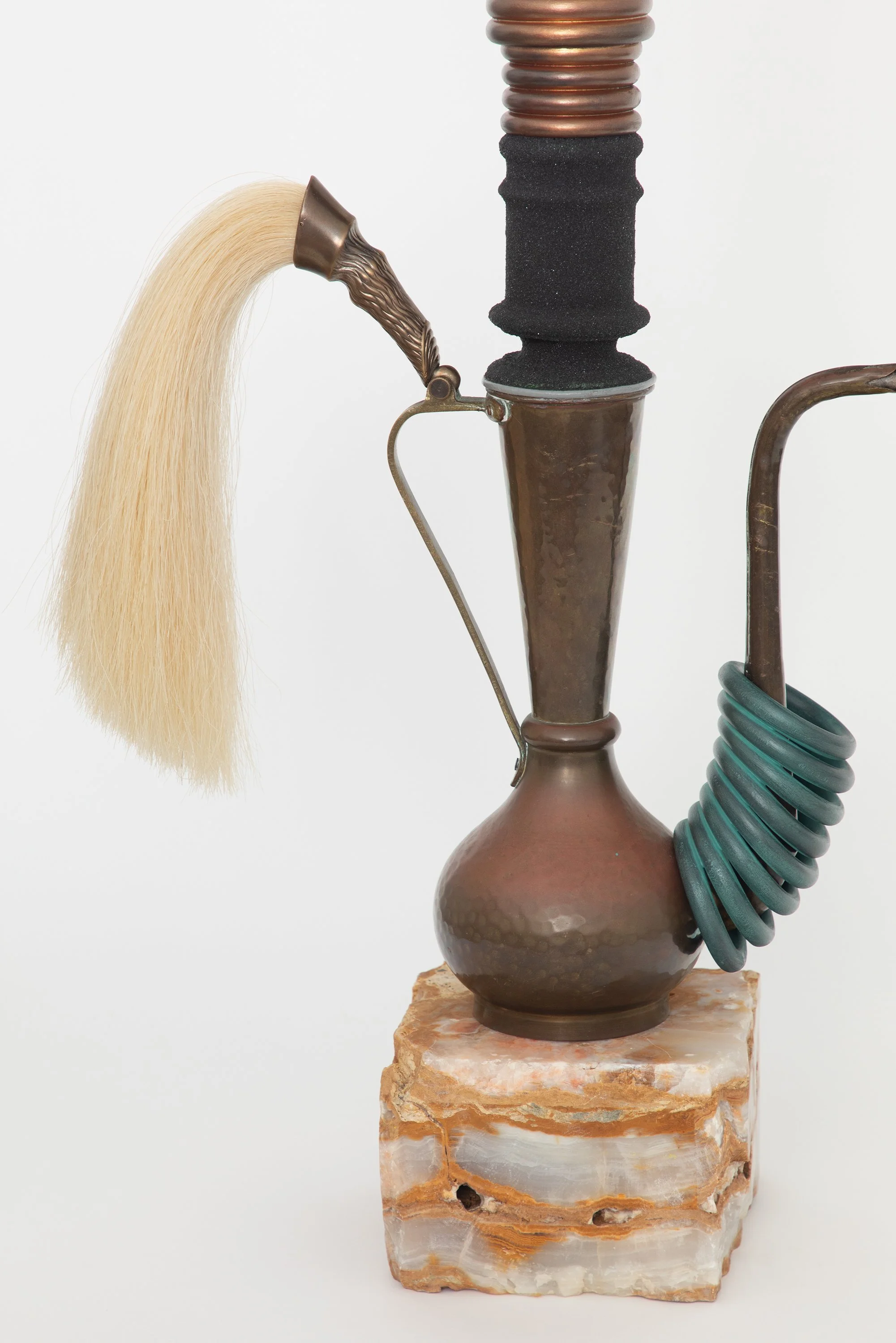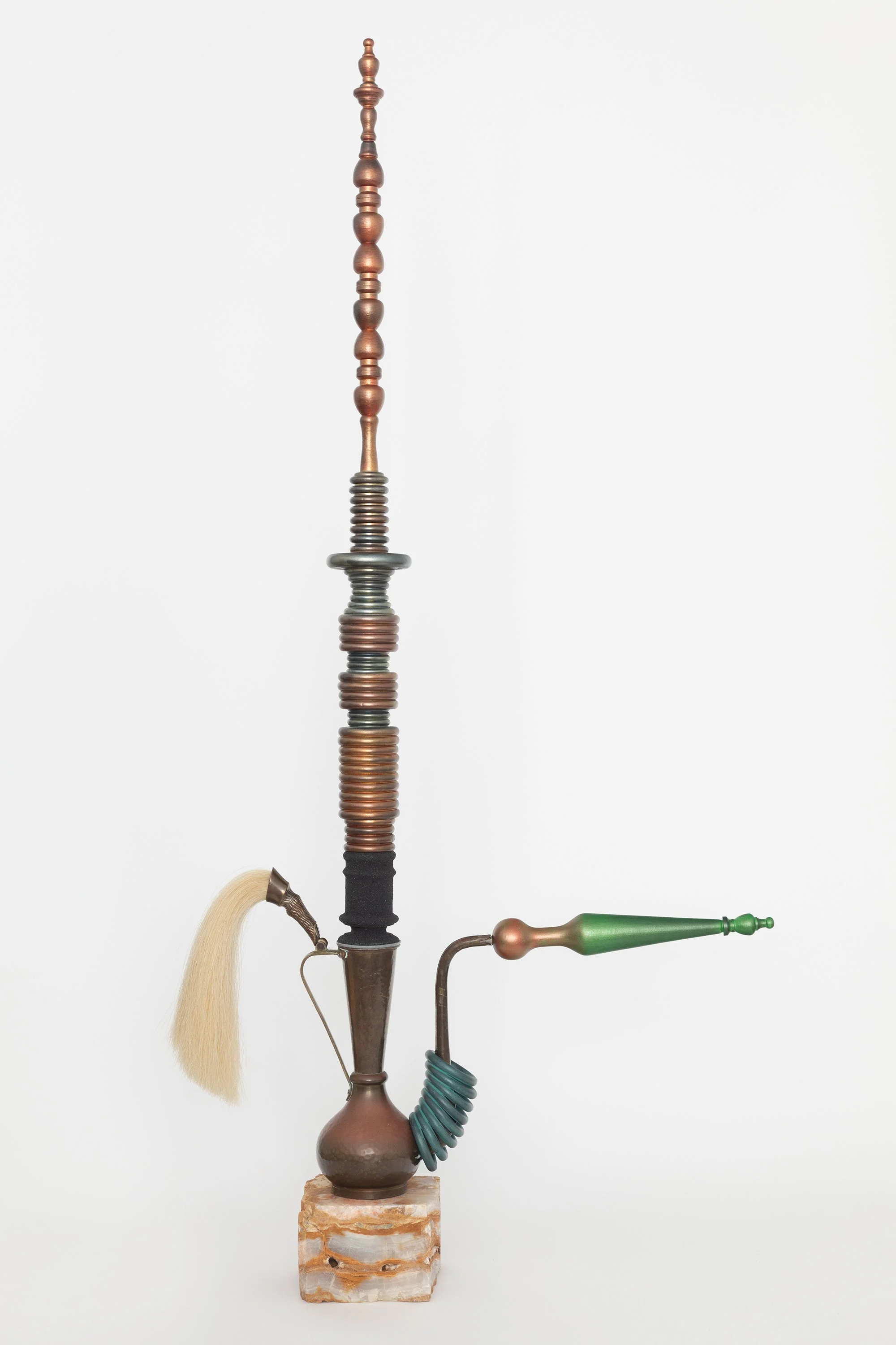 wood, brass, copper, horse hair, black sand, acrylic