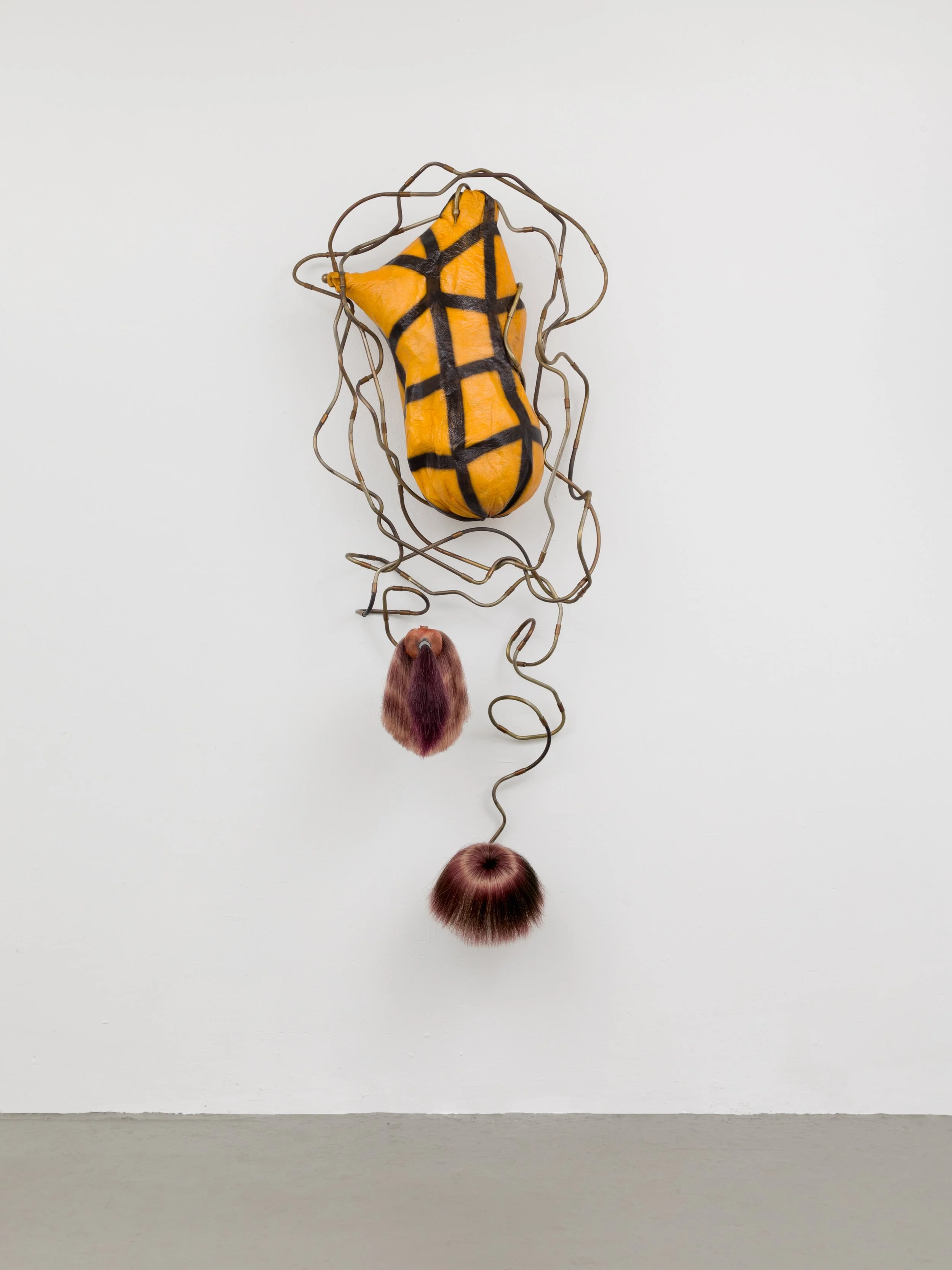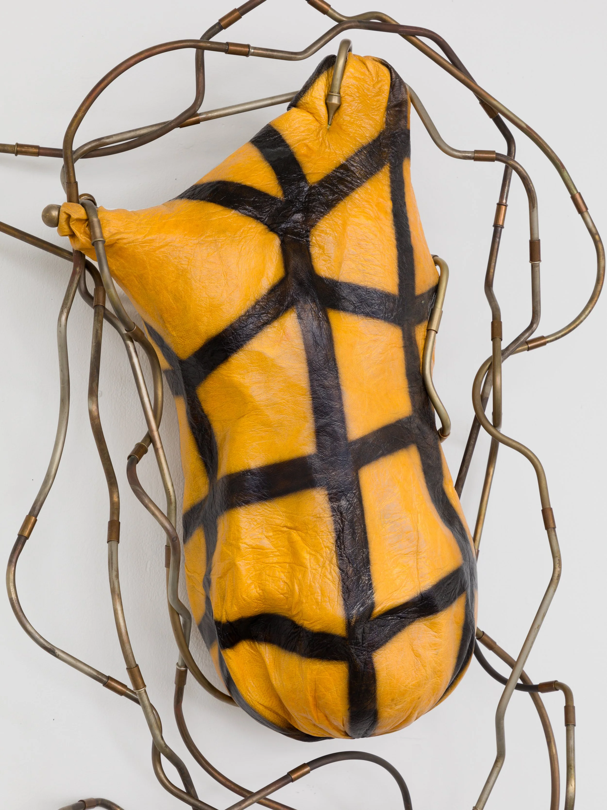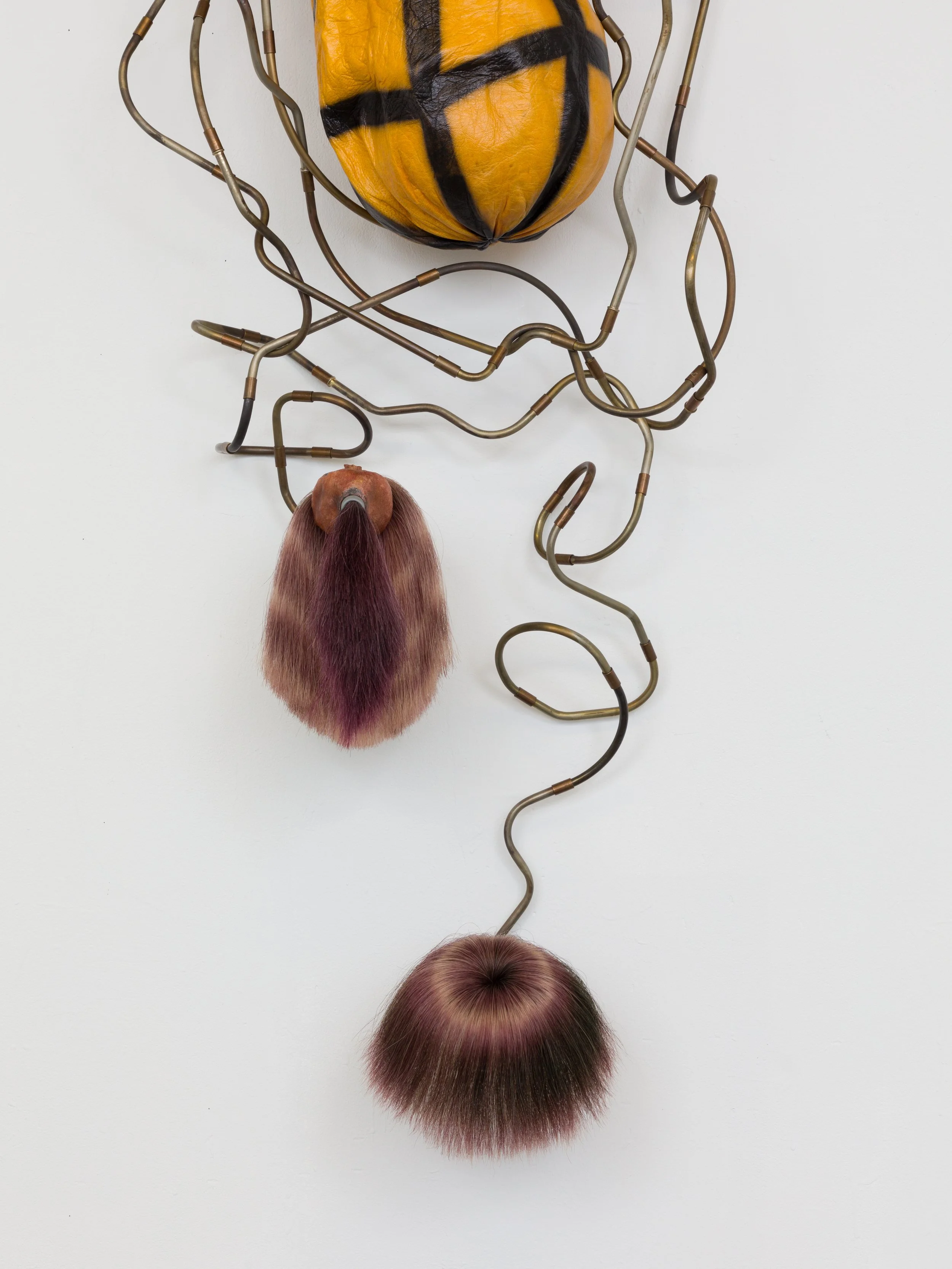 goatskin, brass, epoxy putty, horse hair, dried pomegranate